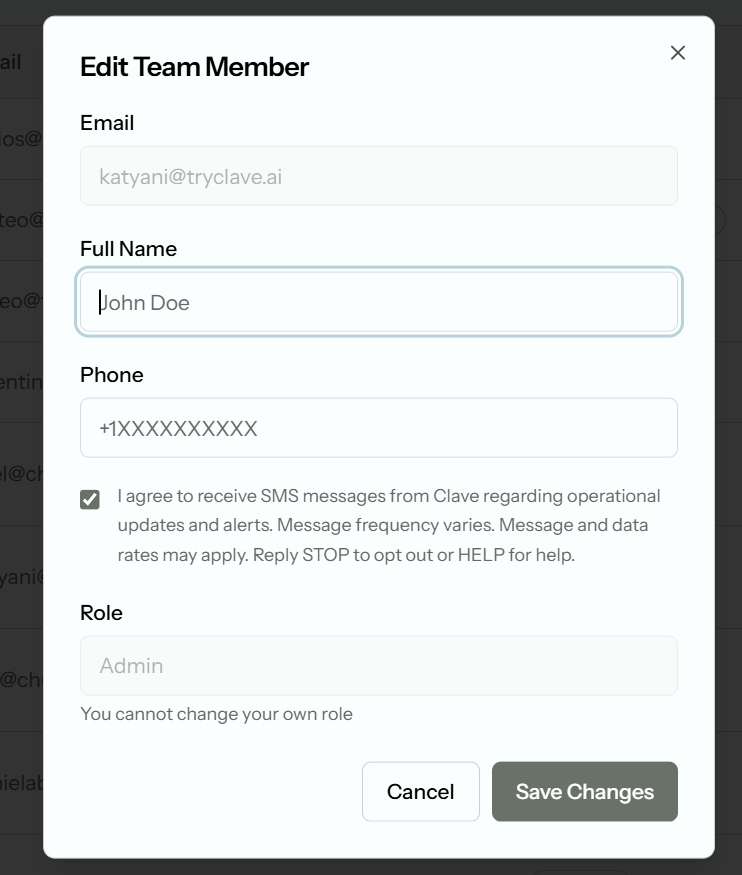 "I agree to receive SMS messages from Clave regarding operational updates and alerts. Message frequency varies. Message and data rates may apply. Reply STOP to opt out or HELP for help."